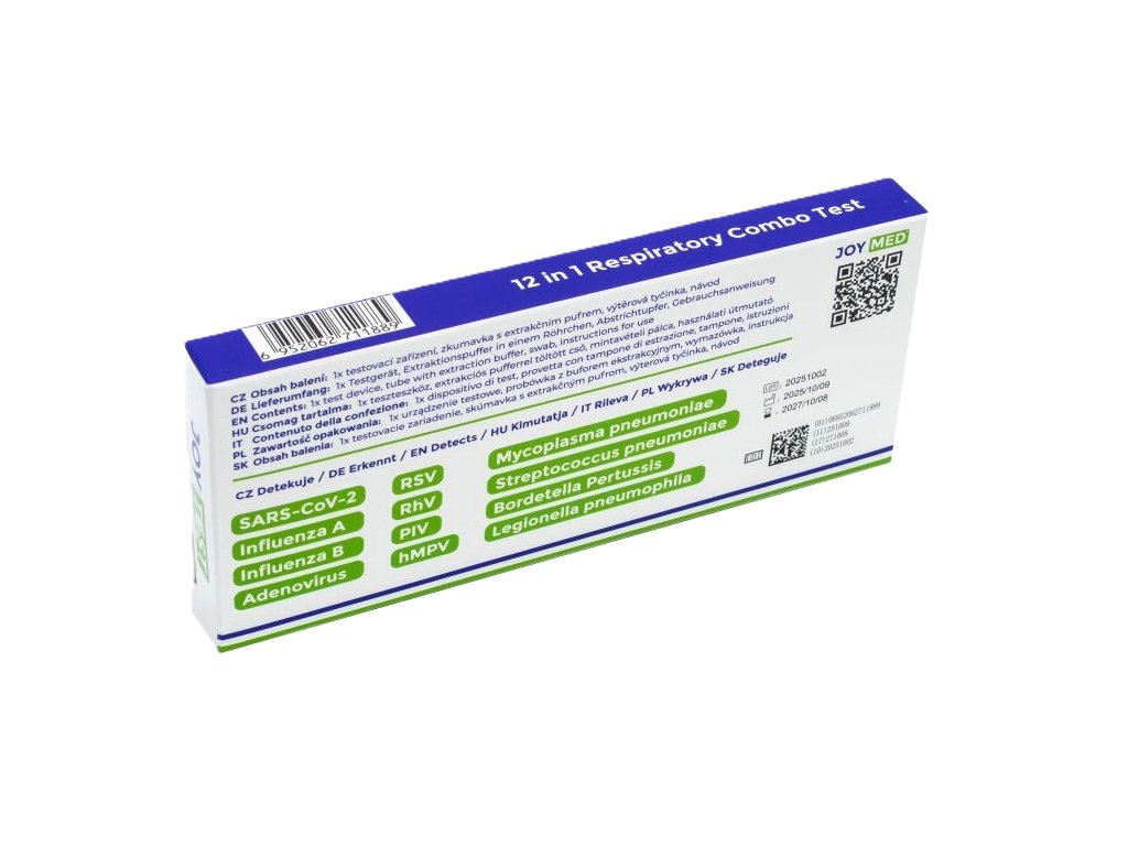 JoyTest 12v1 je špičkový profesionální antigenní test navržený pro rychlou a přesnou diagnostiku široké škály respiračních infekcí. Z jediného výtěru z nosu nebo nosohltanu detekuje až 12 různých patogenů, které se běžně vyskytují v klinické praxi a často mají podobné příznaky.