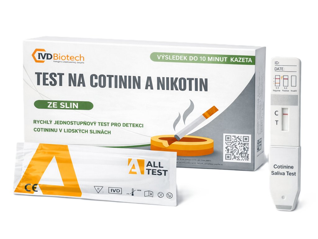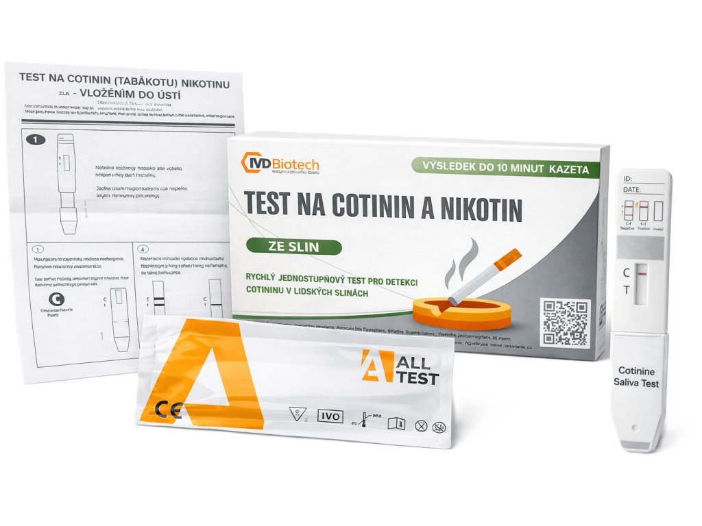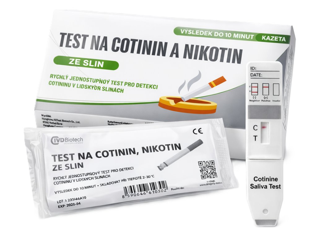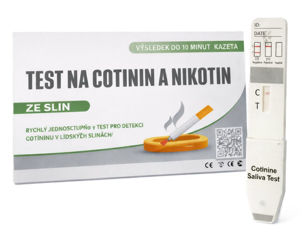 - Test je určen k orientačnímu zjištění přítomnosti nikotinu/kotininu po kouření tabákových výrobků, používání elektronických cigaret nebo nikotinové substituční terapie (žvýkačky, náplasti apod.).