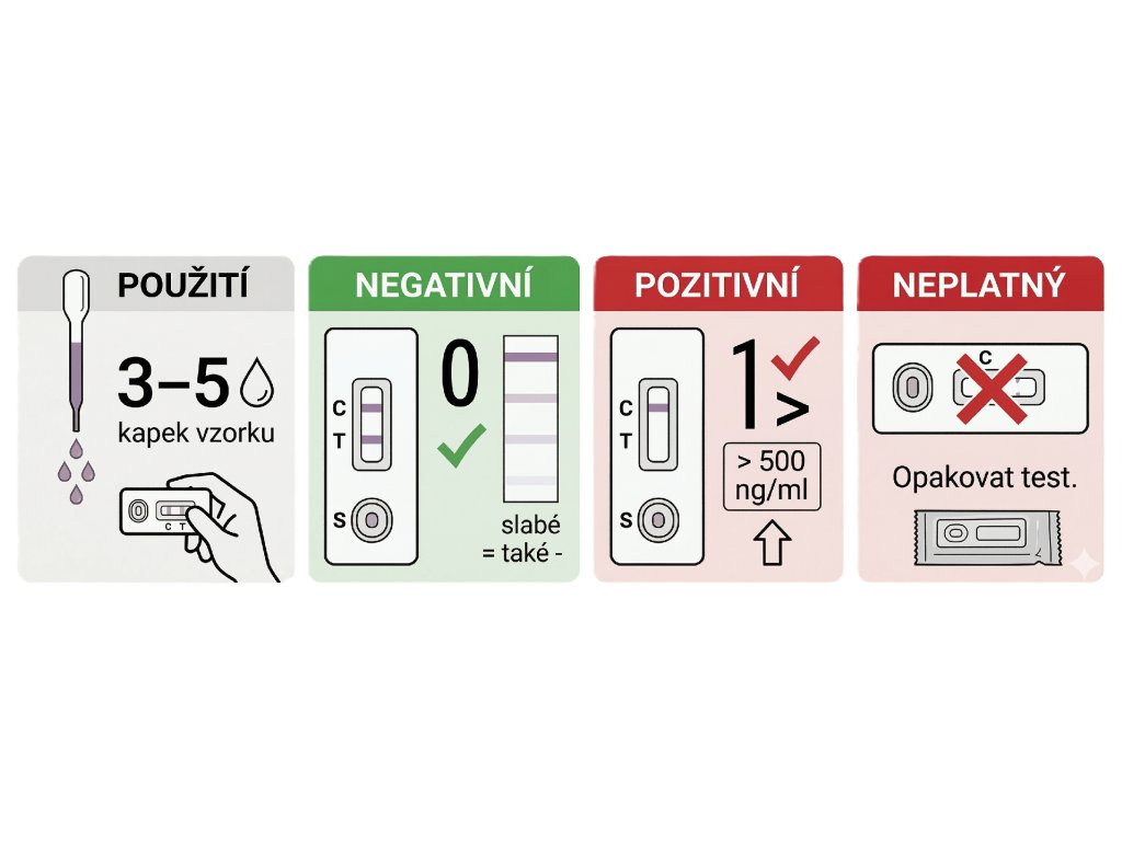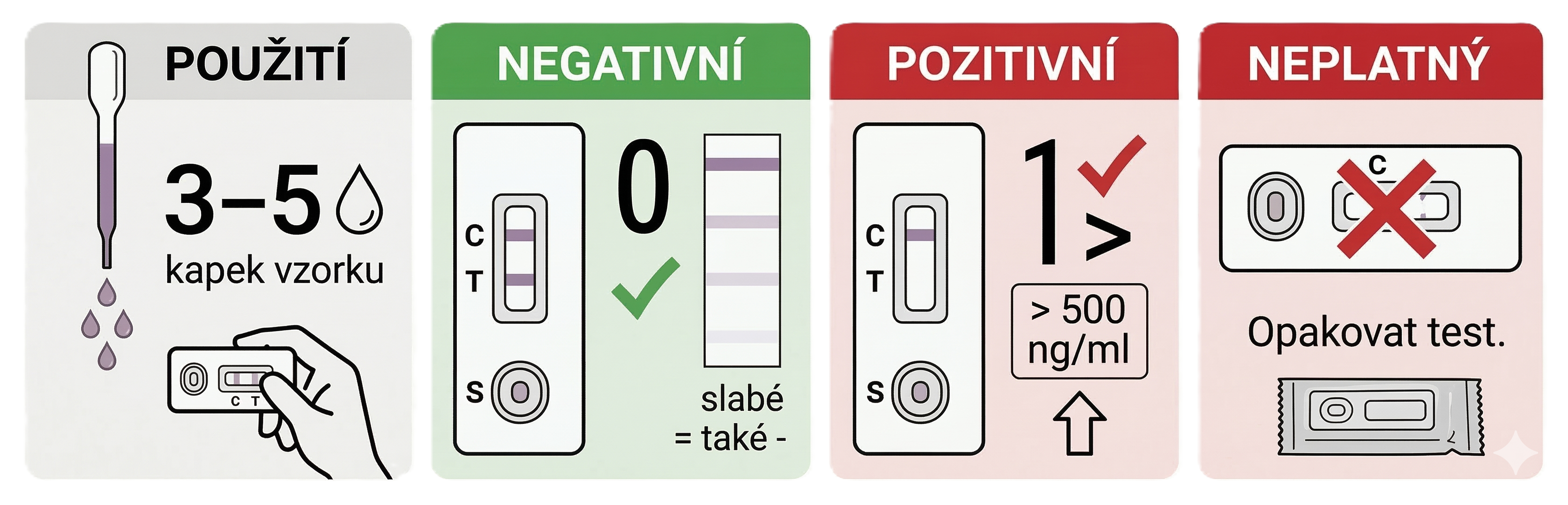 - Jednoduchá interpretace: Výsledek je založen na principu kompetitivní vazby – přítomnost barevné linky v testovací oblasti znamená negativní výsledek (čistý vzorek).