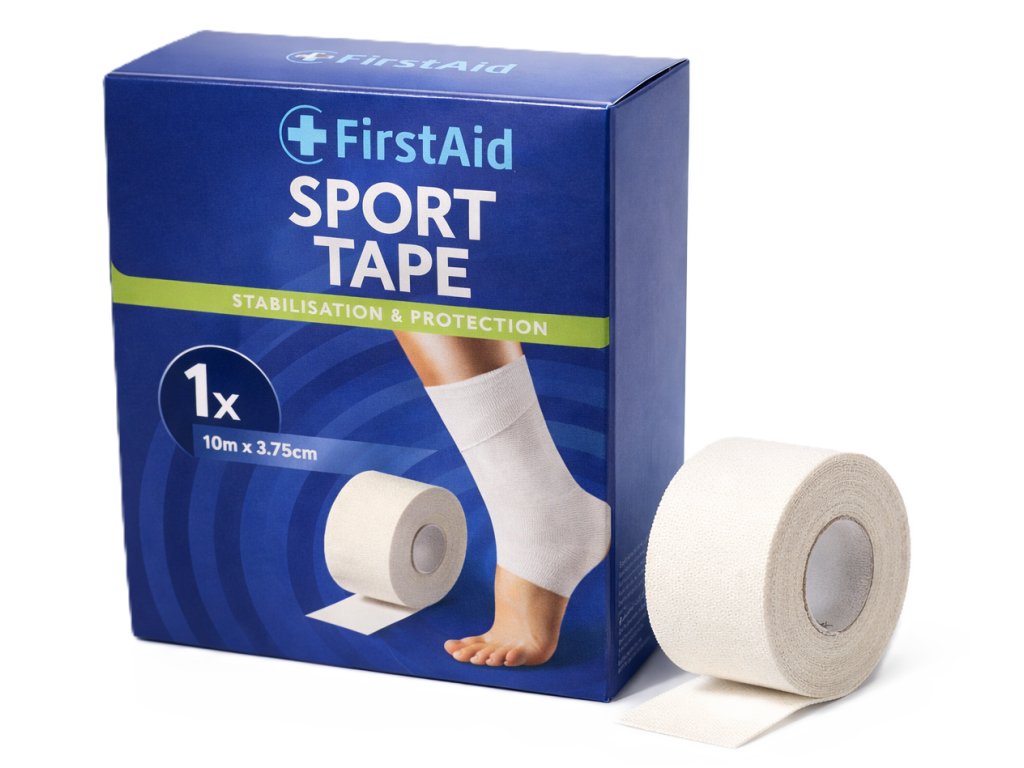FirstAid Sport Tape je klasická pevná tejpovací páska určená pro stabilizaci a zpevnění kloubů při sportovní aktivitě.