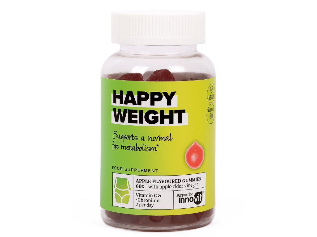 Dopřejte svému tělu přirozenou podporu při udržení zdravé hmotnosti. Gumové bonbony Innovit Šťastná váha – Jablečný ocet kombinují jablečný ocet, chrom a vitamín C, které přispívají k normálnímu metabolismu tuků a sacharidů.
