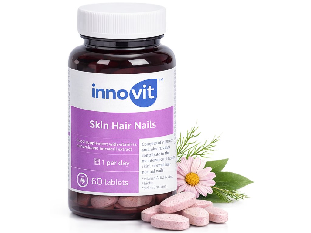 Pokožka, vlasy, nehty Innovit je vyvážený komplex vitamínů, minerálů a rostlinných extraktů, který podporuje přirozenou krásu a vitalitu. Obsahuje mimo jiné vitamíny A, B2, C, biotin, zinek a selen, které přispívají k udržení normálního stavu pokožky, vlasů a nehtů.
