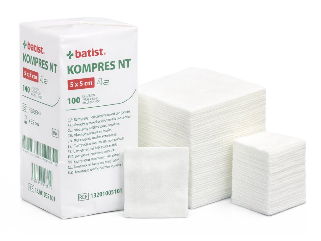 Kompres z netkané textilie je vyroben ze 70% viskózy a 30% polyesteru. Tato tkanina o plošné hmotnosti 30 g/m² vyniká vysokou savostí a prodyšností, což ji činí ideální pro ošetření znečištěných a infikovaných ran. Kompresy se snadno manipulují a nelepí okraje.