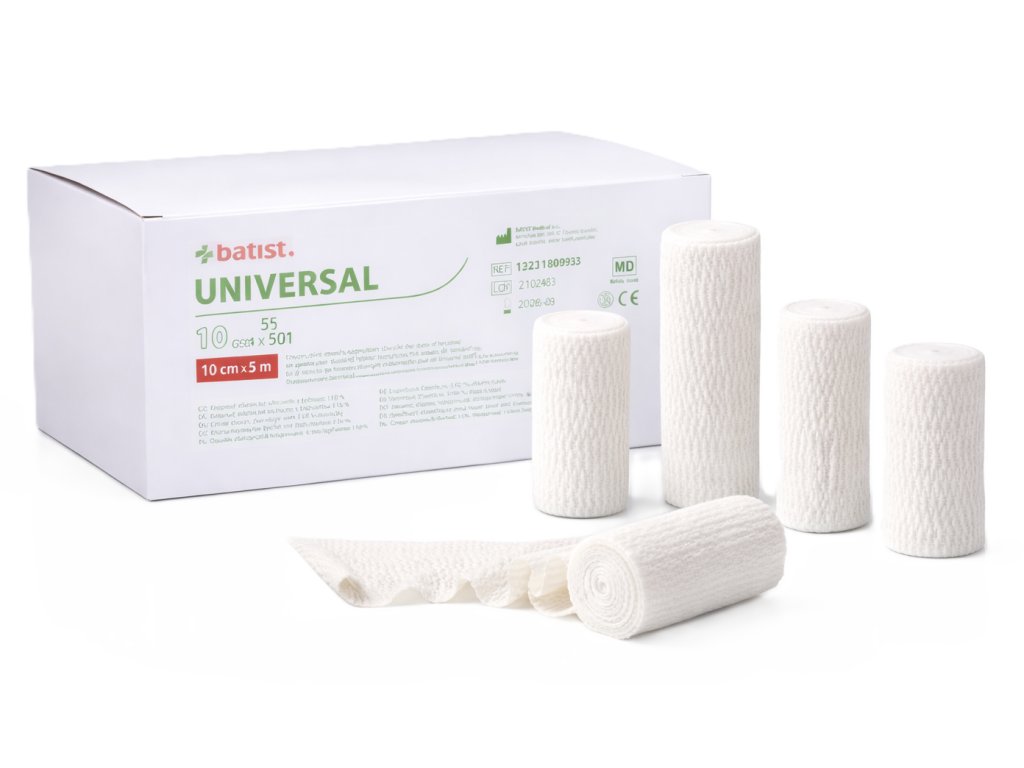 Universal je elastické obinadlo s tažností cca 110 %, vyrobené z měkké tkaniny s vysokým podílem přírodních bavlněných vláken. Díky své krepovité struktuře se snadno přizpůsobí tvaru končetiny, a to i na oblých částech těla, kde nesklouzává. Je ideální pro podpůrné a odlehčovací použití při poraněních pohybového aparátu a po operacích žilních komplexů.